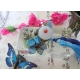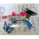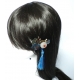 Elegant Chinese hair-clasp features a large white traditional jade bi (disc) accented with red agate, a blue iridescent Czech glass flower with an amber bead in its center, a large leaf carved carefully out of black shell, dyed peacock-colored freshwater pearls as well as a transparent blue-tinted glass butterfly. It is ornamented with trailing tassels in two shades of blue.