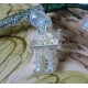This finely etched silver Chinese hair stick features glittering crystals, handmade blossoms with opalescent milky white glass petals as well as a delicate filigree silver Chinese lantern.