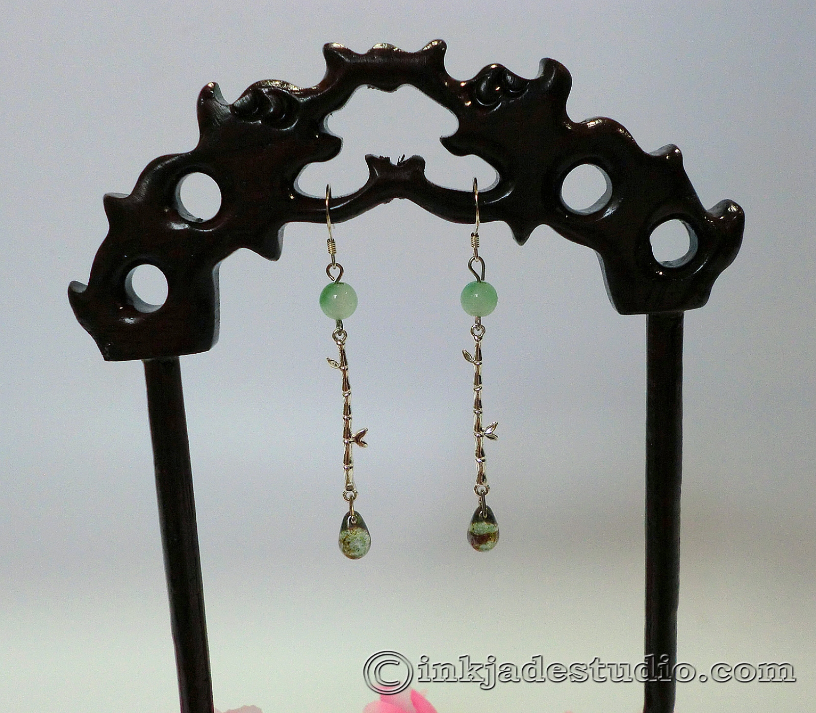 Refined Chinese earrings feature sterling silver earring hooks, green jade beads and silver bamboo as well as green Czech glass drops charmingly flecked with brown. Bamboo is an important plant in Chinese culture symbolizing virtue, modesty, resilience and uprightness. It is a popular subject for traditional ink paintings and is also used for making traditional Chinese flutes as well as myriad other uses.